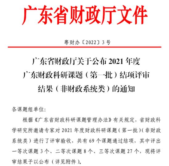 2022年3月29日,广东省财政厅公布了2021年度广东省财政科研课题(第一批)非财政系统类结项评审结果,beat365高艳荣教授的课题《积极财政政策与高技术产业创新》、马玉娟老师的《应对新冠疫情减税降费的政策效应研究》课题成功通过省财厅的评审验收,其中,高艳荣教授的课题被评为二等次。