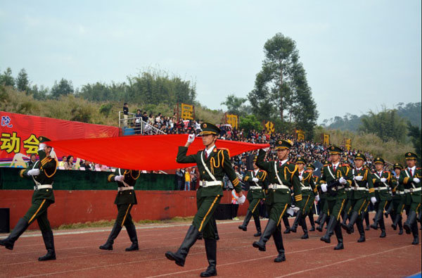 随着万众瞩目的开幕式正式拉开帷幕,国旗队带着整齐的正步进场,紧随其后的是各系方队陆续进场,整个场面整齐壮观。正步过后,伴随着国旗缓缓升起,华商学院第七届校运会正式开始。