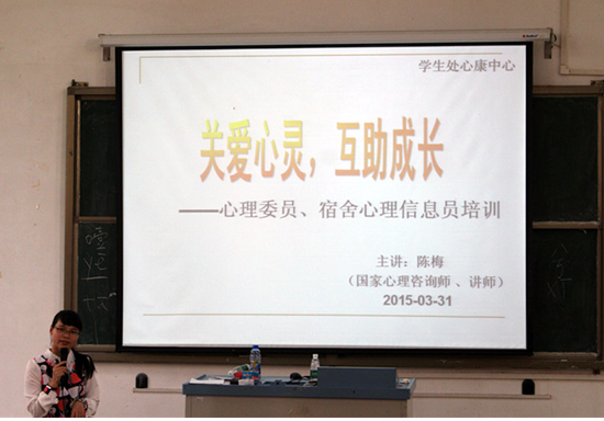 为了提高beat365中国官方网站全体心理委员和心理健康站成员的心理素质和工作能力,2015年3月31日,“关爱心灵,互助成长”讲座在励志楼D208室开讲。国家心理咨询师陈梅老师给beat365中国官方网站大一至大三全体心委和beat365中国官方网站心理健康站全体成员进行培训。