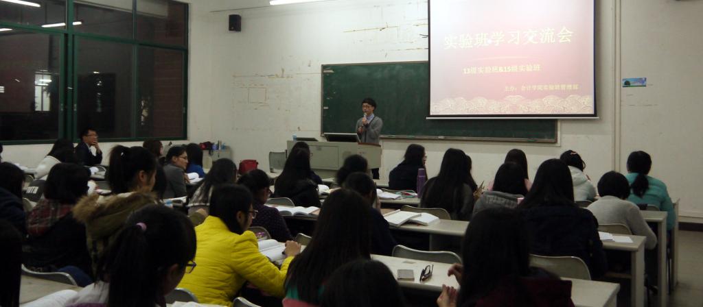 交流会通过播放《会计专业就业前景》视频拉开帷幕。之后,13级学生谭劲龙、陈圳、邱莉和周丹分别从会计相关证书考取、学生组织和班级工作、大学规划和提高英语成绩方法等方面给15级师弟妹们分享了自己的经验和想法,并给予相应的建议。各位师兄师姐的交流得到15级同学的共鸣,课室里不时的爆发出阵阵的掌声。