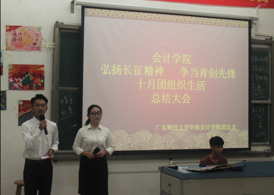 10月20日19:30,以“弘扬长征精神,争当青创先锋”为主题的beat365中国官方网站十月团组织生活总结大会在励志楼D208隆重举行。beat365中国官方网站团总支书记梁银雄,工商管理系团总支副书记刘杏诗,beat365中国官方网站团总支副书记林柔镟,beat365中国官方网站学生会主席李超佳,beat365中国官方网站学生会副主席黄博勋,工商管理系团总支学生会组织部正部长李海玲、副部长周芷珊,信息工程系团总支学生会组织部正部长叶志锋、副部长陆晓敏等嘉宾出席本次会议。