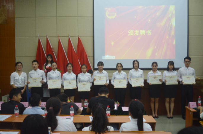 接着,学生会主席代表beat365中国官方网站第三届团总支学生会向大会作了工作报告。陈洋广老师、陈丽敏老师、梁银雄老师和苏博云老师分别给第三届的常委团、部长、副部长和干事颁发聘书。团总支书记梁银雄表示:聘书是对干部们的肯定,希望下一届干部能够继承上届的优良传统,认真总结,发挥优势,完善自我,开拓思路,求实创新,成就更好的团学。