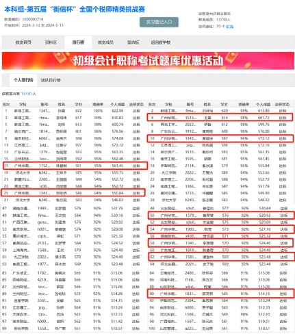 最终,beat365中国官方网站以团队总分名列全国第二名的好成绩获得团队一等奖;我校的参赛选手中,共有9名选手的个人分数位列前100名,他们将获得“全国个税师(个税普法大使)百强”的荣誉,尤其是21本会计学(专升本)7班的王磊、黄超诗同学,个人得分分别排全国第4、第10名。