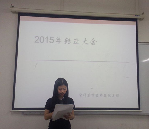 然后,由7名中共预备党员上台宣读自己的转正申请书,再由正式党员举手表决。各位中共预备党员都获得全票通过,成为我们华商beat365中国官方网站学生第三党支部的一员。