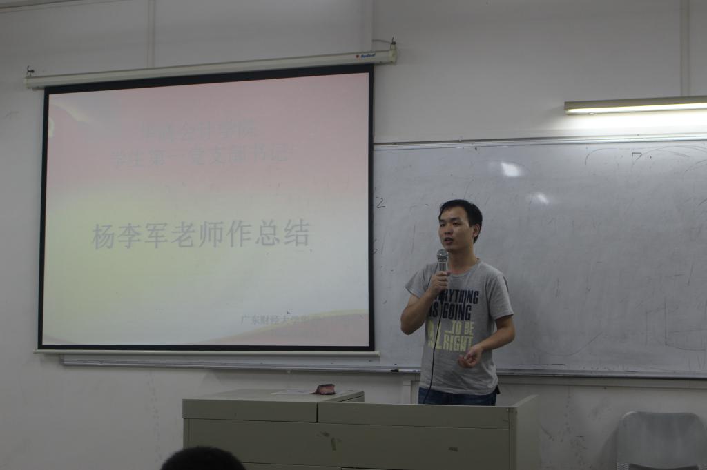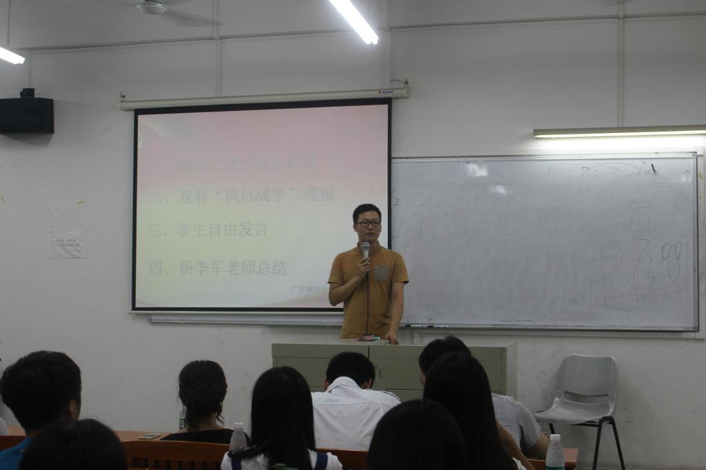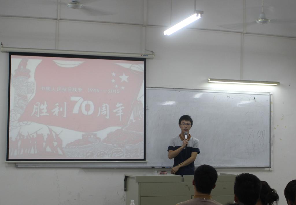 最后,第一党支部书记杨李军做了总结发言。他认为中国共产党之所以成为抗日战争的中流砥柱,是因为国共合作全民族统一抗日战线是由中国共产党首先提出的,正视自身,不妄自菲薄,因能力而制定战略,1940年后中国共产党在敌后战场牵制了日军60%的力量。中国近代军事化遇到四次阻碍都是日本,今年如此重视世界反法西斯战争70周年,不是要唤醒仇恨,而是铭记历史,实现中国现代化,大到国家,小到学校,集体,只有团结一致,工作才能顺利进行。