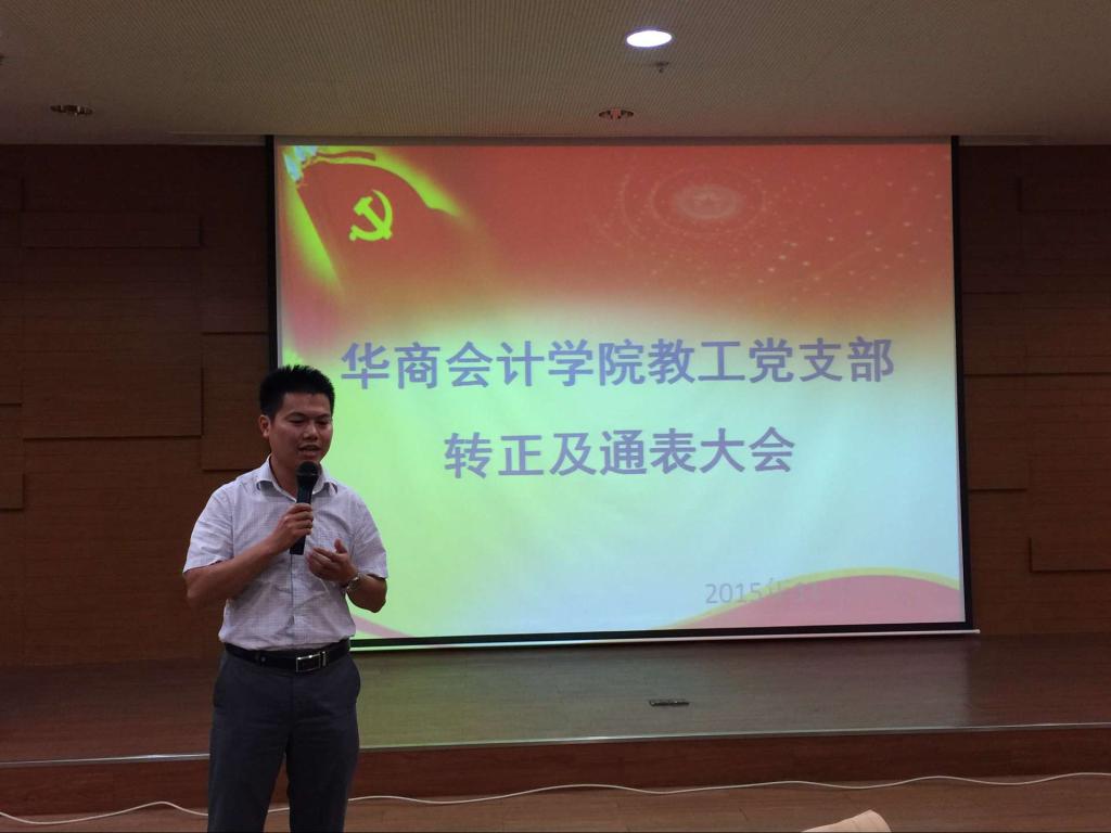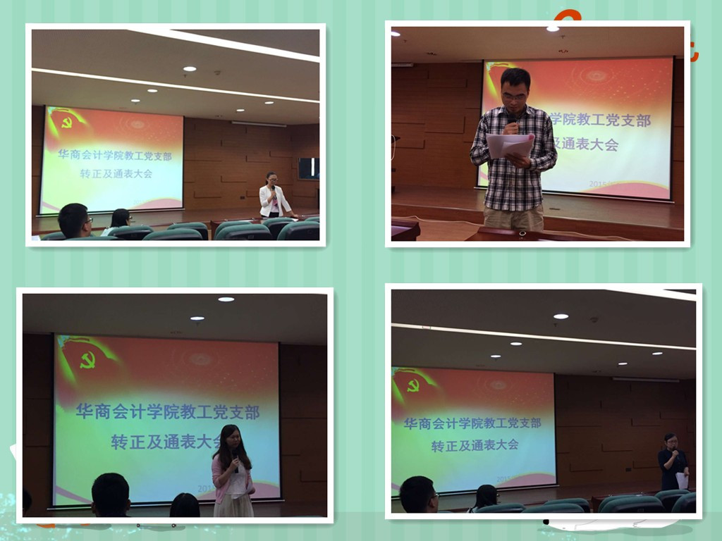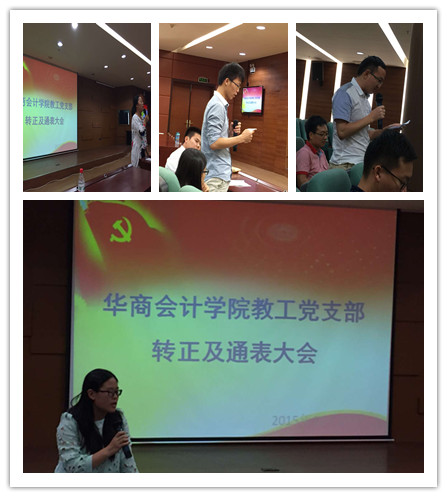 2015年11月17日17:00,华商beat365中国官方网站教工党支部2015-2016学年第一批通表大会及预备党员转正大会在图书馆一楼报告厅隆重举行,出席本次会议的有华商beat365中国官方网站党总支许娜副书记、教工党支部王敏书记和全体党员及4位发展对象。