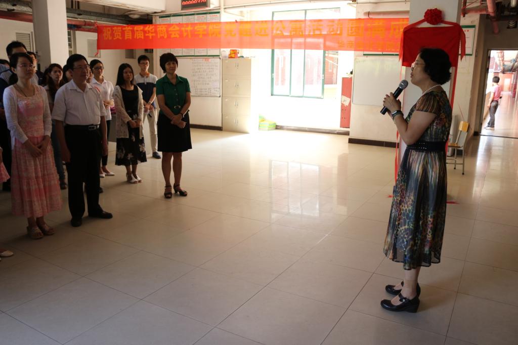 揭牌仪式共有三项议程。仪式第一项议程,马玉珍副院长上台致辞。马玉珍副院长非常肯定“党建进公寓”活动。马副院长认为该项党建活动开启了华商beat365中国官方网站学生党支部党建工作的先河,学生党员进入寝室,可以发挥党员模范作用,传播正能量,团结同学,服务同学,发扬党员精神。在此,马副院长也寄予了两点希望。一:党建工作不要形式,学生党员要发挥战斗堡垒作用,落实党员责任,发挥党员作用,把热爱祖国、热爱党、热爱生活的正能量思想传播予身边同学。二:学生党员要发挥服务意识,辅助寝室管理,促使寝室管理工作有所改变,带动寝室舍友及身边同学营造“好好学习、努力工作”的氛围,树立正确的三观,提高自己和普通同学对党更深层次的认识,培养爱国情怀,树立远大理想,国家繁荣富强需要我们努力。