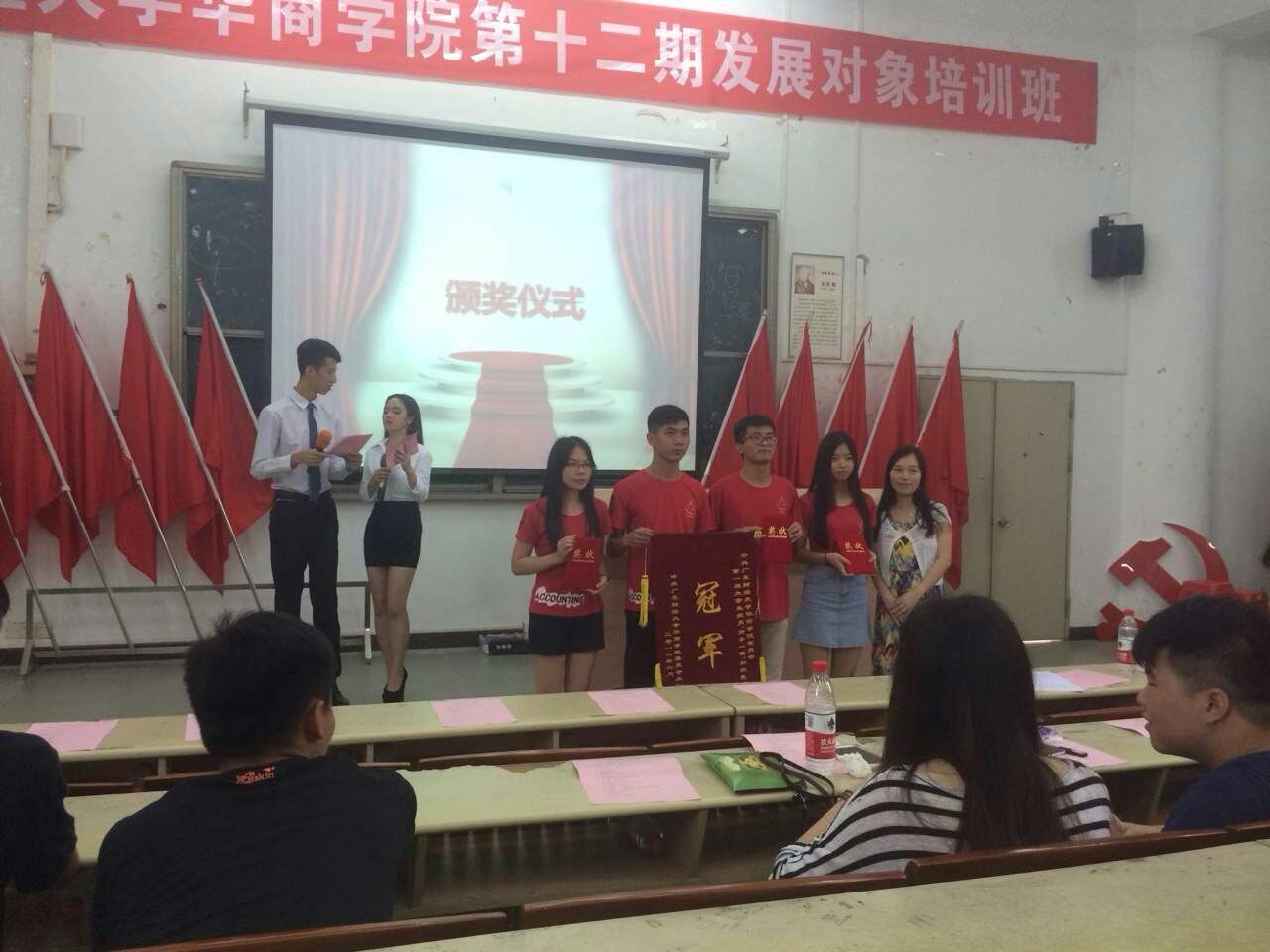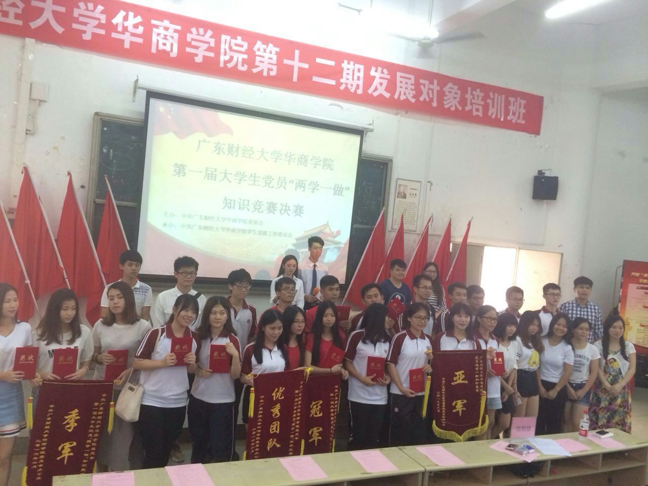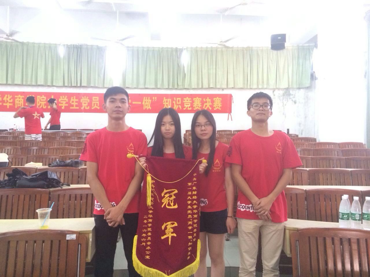 2016年6月7日下午,由院学生党建工作委员会主办的“两学一做”知识竞赛总决赛在励志楼B308隆重举行,华商学院八大院系学生党支部组织代表队伍积极参加。beat365中国官方网站学生党支部也派出了在beat365中国官方网站“两学一做”知识竞赛初赛中取得优异成绩的彭天育、张英泽、胡淑青、杨勇花4位党员同志组成的“智者联盟”队代表beat365中国官方网站出赛,并勇夺冠军,可喜可贺!