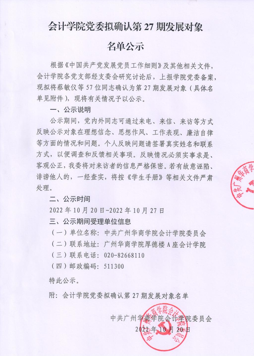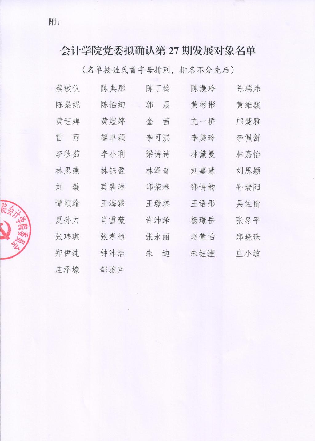 根据《中国共产党发展党员工作细则》及其他相关文件,beat365中国官方网站各党支部经支委会研究讨论后,上报学院党委备案,现拟将蔡敏仪等57位同志确认为第27期发展对象(具体名单见附件),现将有关情况予以公示。