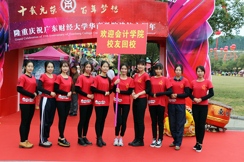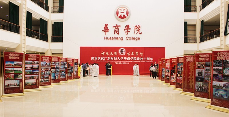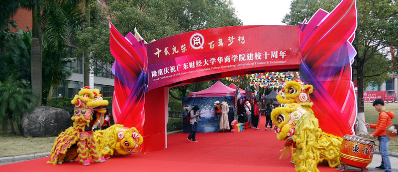讴歌十年华诞,续写世纪新篇。2015年12月26日,广东财经大学华商学院迎来了建校十周年庆典。在这个杂夹着寒风的早晨里,华商学院与往日不同,随处可见绿衣志愿者们在寒风中坚守岗位,礼仪小姐们面若桃花,在接待处恭候嘉宾的老师工作人员们带着止不住的喜悦,踏上用十年光阴铺成的红毯,看看校园内的彩旗缤纷、花草艳丽以及满面红光行人们,浓郁的节日氛围环绕着整个学院,处处都是好风光。