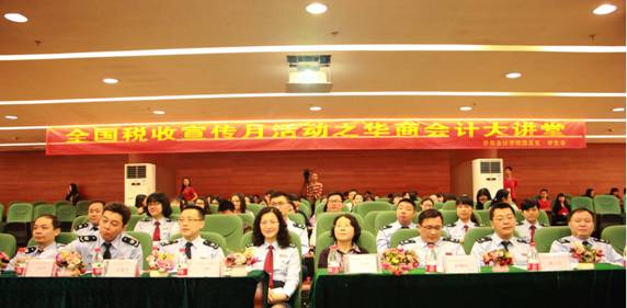 华商beat365中国官方网站与广州市国税局东区稽查局、增城区国税局、增城区地税局继2015年共建税收宣传教育基地、隆重举办首届税收知识大赛之后,4月12日下午,华商beat365中国官方网站再次联手广州市国税局东区稽查局、增城区国税局、增城区地税局,四方代表在学院图书馆报告厅隆重开展税收宣传月活动暨举办华商会计大讲堂。参加本次活动的领导有广州市国税局东区稽查局谭斌副局长、何希文副局长、聂国祥副调研员;增城区国税局王春平副局长、陈上公纪检组长;增城区地税局钟健民副局长、梁海鹰稽查局局长冯长风以及华商学院马玉珍副院长。此外,广州市国税局东区稽查局、增城区国税局、增城区地税局的相关工作人员及华商beat365中国官方网站师生代表也参加了本次活动。
