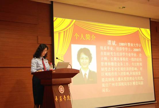 讲台上,增城区国税局纪检组长陈上公,广州市国税局东区稽查局副局长谭斌和该局陈峻杉副科长分别作了《介绍营业税改征增值税试点政策影响》、《如何成为一名合格的税务人员》、《从税务稽查角度谈会计从业人员的必备能力和素质》的主题报告。他们引经据典,结合实例,充分给华商学子们介绍“营改增”的实施现状及所带来的影响,启发学生从专业角度思考自我的职业发展选择和突破,并说明当下会计人员应必备的能力和素质。现场同学们参与踊跃,积极提问,与主讲嘉宾们形成很好互动,会场不时爆发出热烈的掌声。
