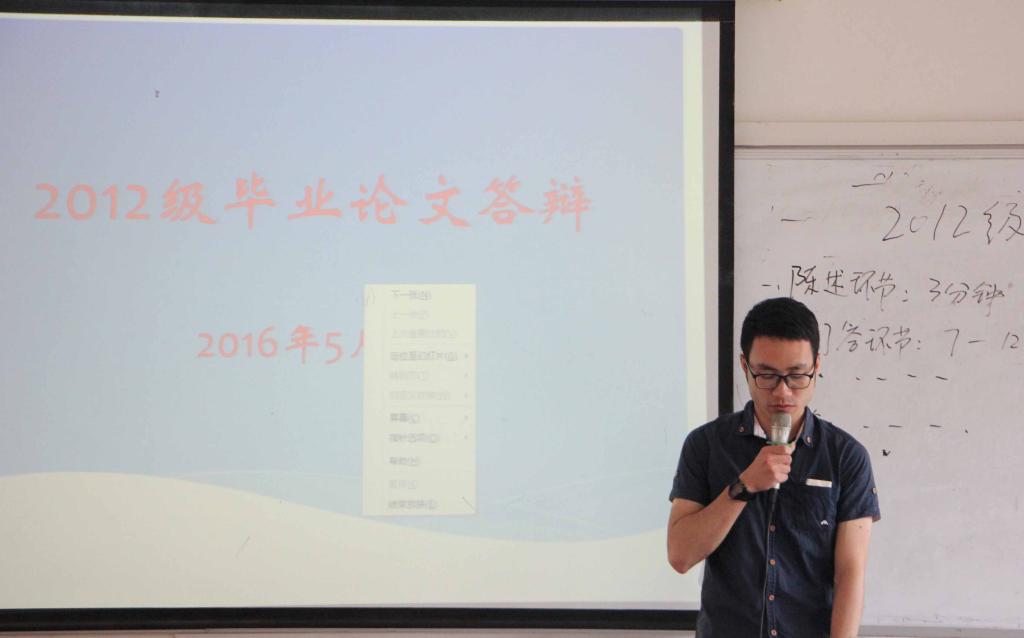 答辩过程分为现场陈述和评委老师提问两个环节,即参加答辩的同学结合PPT先对自己的论文进行5分钟的陈述,陈述完毕,由评委老师根据学生的论文提出若干问题,同学们现场进行回答。这不仅考验了同学们对论文的熟悉程度和对专业知识的掌握程度,而且也考验了同学们的应变能力。最后,答辩老师根据学生们的回答及表现行进行打分并指出了某些同学毕业论文存在的不足,并给予意见。
