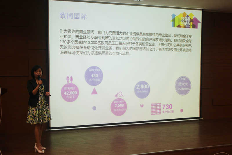具有中国注册会计师和注册资产评估师的资质的郑馥丽女士首先上台发言。她介绍了致同会计师事务所在行业中重要地位,阐述了致同业务范畴、服务质量、客户资源和团队文化,并重点分享了致同“合作、领先、卓越、响应、尊重、责任”的企业价值观。鼓励同学们不要埋怨自身所处环境,积极进取,不断学习,追逐梦想。“我们的员工可以不是重点大学毕业的,我们要的是与我们价值观相近,不怕苦,积极向上的人”。郑女士如是说。