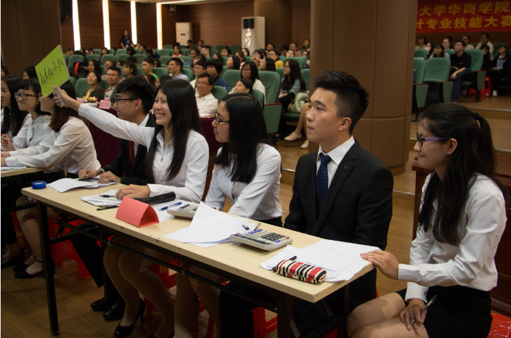 从2000多名参赛者中脱颖而出的六组选手(每组5人)通过专业知识考核、点钞、背背猜和财会辩论等4个环节进行比拼,以最终累计的成绩决出名次。团队协作时那默契的配合,抢答时那快速反应能力,点钞时那娴熟的手法、制作分录时那快速的运算、财会辩论时那生动的语言,让现场的观众们都赞叹不已。各个小组的分数在各个环节不断地交替领先,比赛进行得紧张而激烈。经过评委们评定,第四组获得一等奖,第三,六组获得二等奖,第一、二、五组分别获得三等奖。