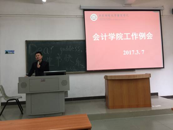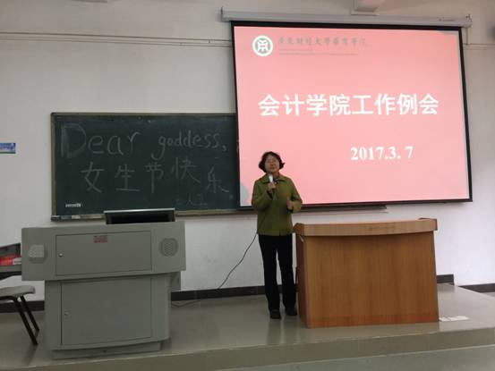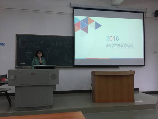 新学期,新气象。3月7日下午,马玉珍院长在励志楼B105主持召开新学期全体教职工大会。马玉珍院长首先向全体教职工详细地汇报了2016年12月19日-23日由她领队,率领朱小云、唐浩、陈雪铃一行四人赴台考察铭传大学、朝阳科技大学、德明财经科技大学、龙华科技大学四所高校的考察经历、考察内容及心得体会。