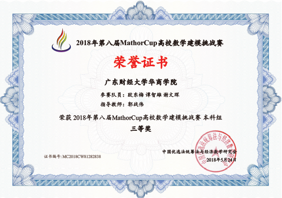 我校于4月05日上午8时至4月09日上午8时组织学生参加了2018年第八届Mathorcup高校数学建模挑战赛,本次竞赛在beat365中国官方网站院长陈美华、副院长罗绍德、巴雅尔、许娜的指示和帮助下,在郭战伟老师的指导下,由beat365中国官方网站学生欧东梅、谭智雄以及经济与金融系学生谢文琛三位同学组成的数学建模队伍在4天的时间里积极探讨,努力思考,最终向组委会提交一份解决实际问题的学术论文。