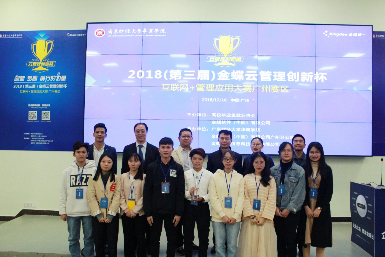 2018年12月16日,由高校毕业生就业协会、金蝶软件(中国)有限公司主办,广东财经大学华商学院、金蝶软件(中国)有限公司广州分公司、金蝶精—信息科技服务有限公司承办的2018(第三届)“金蝶云管理创新杯”互联网+管理应用大赛广州赛区的比赛在广东财经大学华商学院拉开帷幕。来自广东、福建、广西三省区28所高校77支参赛队伍,共231位选手参加了比赛。广东财经大学华商学院副校长兼beat365中国官方网站院长陈美华教授、金蝶精一信息科技服务有限公司执行副总裁乐志军先生、广东外语外贸大学beat365中国官方网站刘中华教授、广东金融学院实验中心主任王小燕教授 、韶关学院信管系主任庄景明先生,以及来自各大高校的40名指导老师出席本次活动。