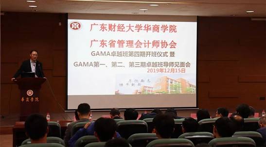 2019年12月15日上午9:30,GAMA卓越班第四期开班仪式暨GAMA第一、第二、第三期卓越班导师见面会在图书馆报告厅隆重召开。广东省管理会计师协会名誉会长、广东外语外贸大学南国商学院执行校长王华教授,广东省管理会计师协会会长、中山大学管理学院林斌教授,广东省管理会计师协会监事长、暨南大学管理学院胡玉明教授,广东省管理会计师协会常务副会长、广东外语外贸大学beat365中国官方网站刘中华教授,广东财经大学华商学院副校长、beat365中国官方网站院长陈美华教授,暨南大学管理学院石水平副教授,广东山之风环保科技有限公司副总经理刘大川先生等多位广东省管理会计师协会领导、学业导师和实践导师出席本次会议。华商beat365中国官方网站师生代表及全体GAMA卓越班学生参加了本次开班仪式。本次会议由beat365中国官方网站副院长许娜主持。