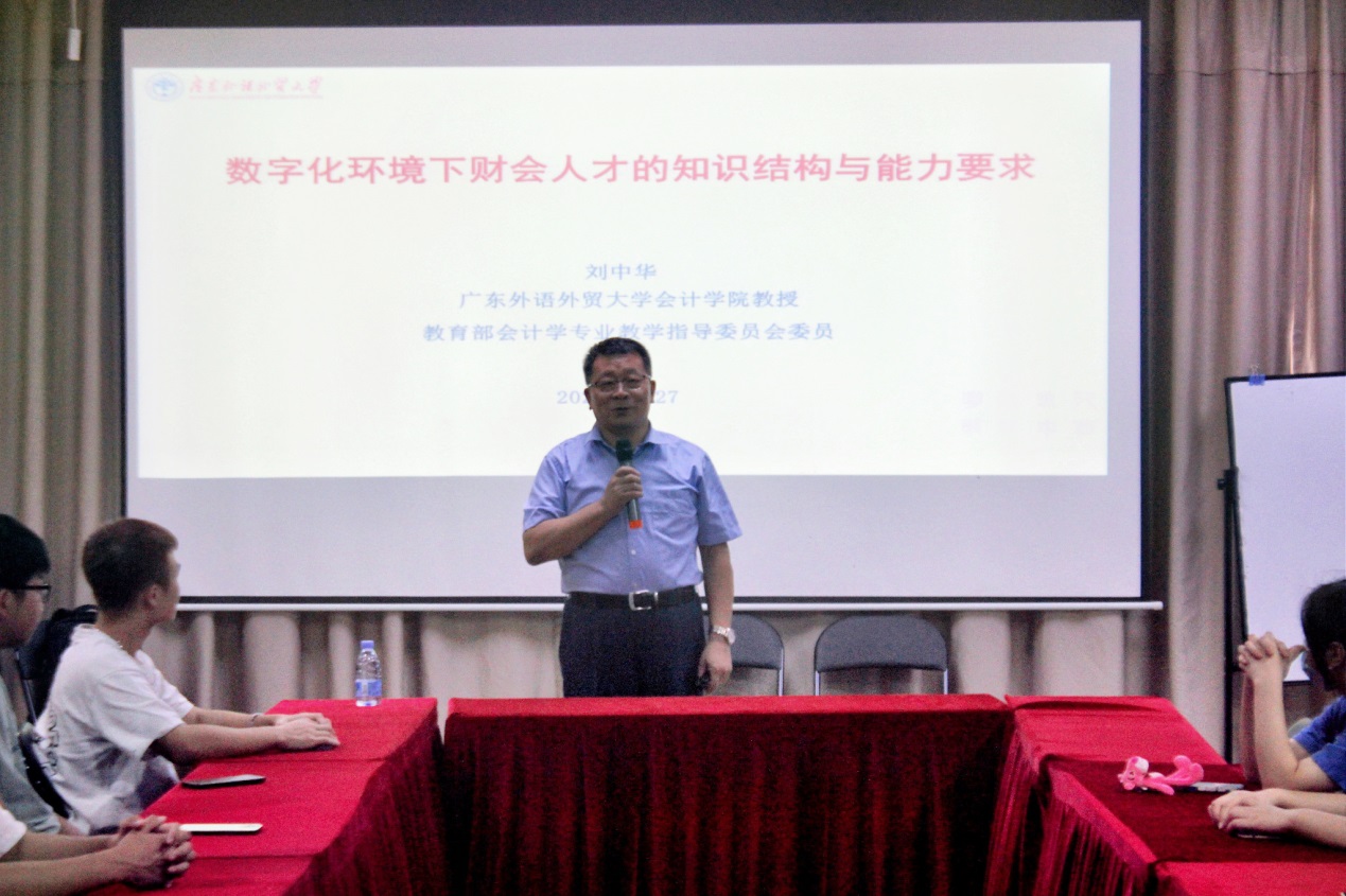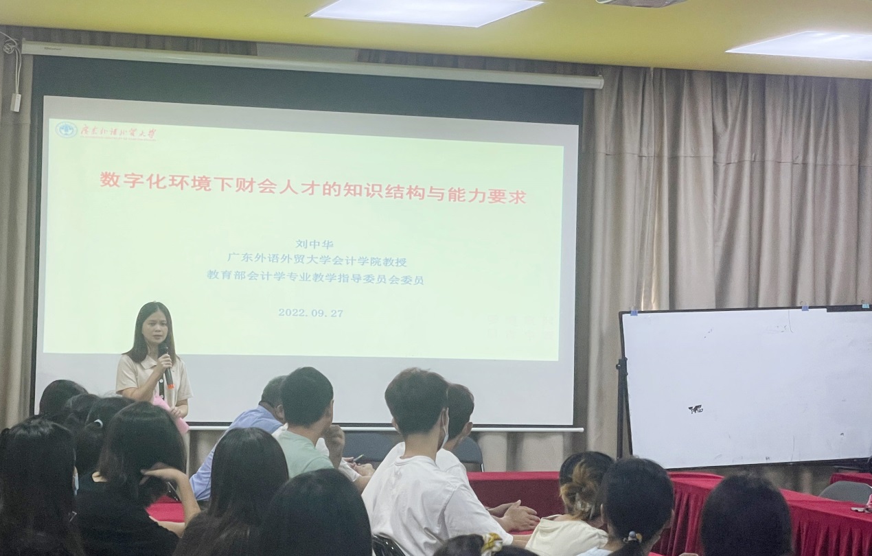 2022年9月27日下午3:00,教育部会计学专业教学指导委员会委员,原广东外语外贸大学beat365中国官方网站院长刘中华教授应邀在beat365中国官方网站报告厅给2021级会计学专业会计智能化方向班学生作了题为《数字化环境下财会人才的知识结构与能力要求》的讲座。