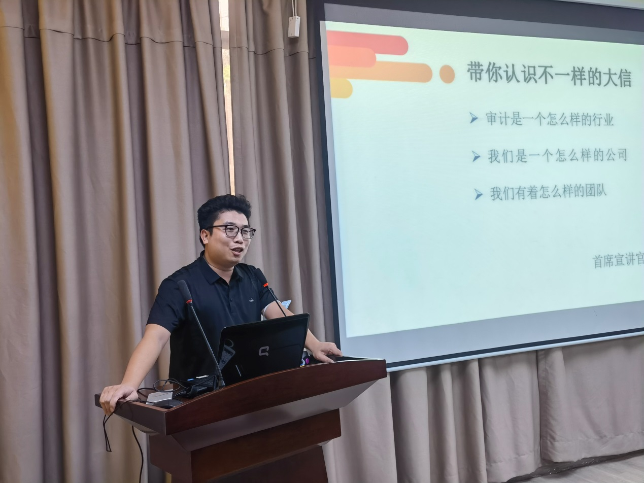 接下来,大信会计师事务所营总监蔡宝弘、项目经理邵磊、人事主管孙昕冉、人事经理王梦歌分别以“带你认识不一样的大信”、“如何做好审计实习工作”、“成为优秀的自己”、“怎样加入我们这个有趣的团队”为主题详细介绍了审计行业的发展趋势及大信会计师事务所的基本概况、业务类型、实习岗位职责、人员需求、企业文化、工资待遇、职业前景等内容。