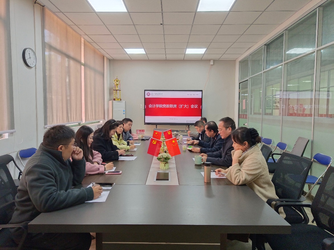 12月16日,beat365中国官方网站党政联席(扩大)会议在学院会议室召开。学院领导班子全体成员、全体党委委员、各系部负责人、数智会计与商务服务产业学院负责人齐聚一堂,共商学院发展大计。此次会议围绕学习贯彻党的二十届三中全会精神、本科教学合格评估阶段性总结、学期末工作部署、教职工集体活动安排及学院人事工作安排等议题,会议由beat365中国官方网站院长姚凤民主持。
