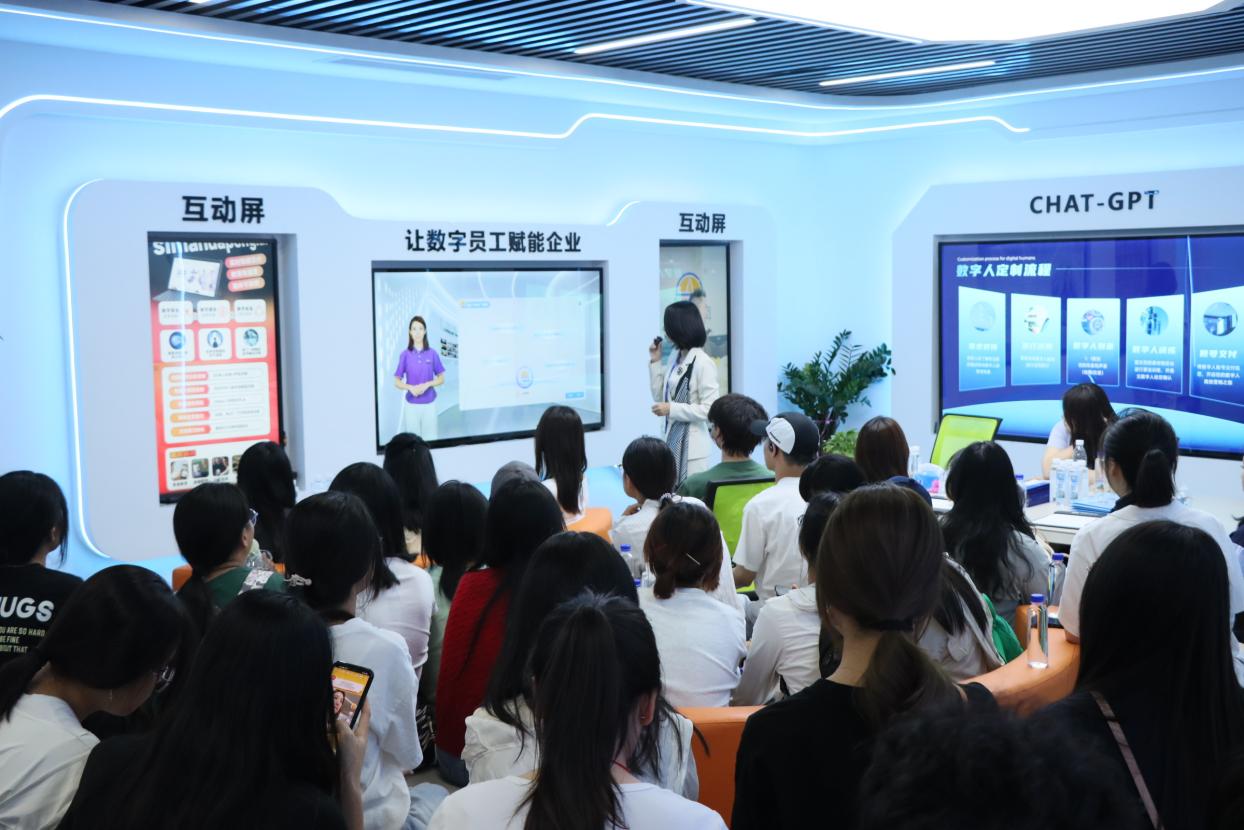 师生实地探访广量集团AI展厅,广量商学院执行院长王佩现场演示了人机互动系统 24 小时智能问答、大数据抓取与知识库调用、隐私保护与知识产权安全等核心功能,该系统能快速回答各类问题,展现 AI 在信息处理与决策支持中的高效性。她强调数字人技术已应用于讲课、直播、跨境电商等场景,尤其在本地生活类直播潜力巨大。同时,她也鼓励大学生积极学习 AI 技能,主动拥抱 AI 技术变革,理解底层逻辑并掌握工具适用领域。