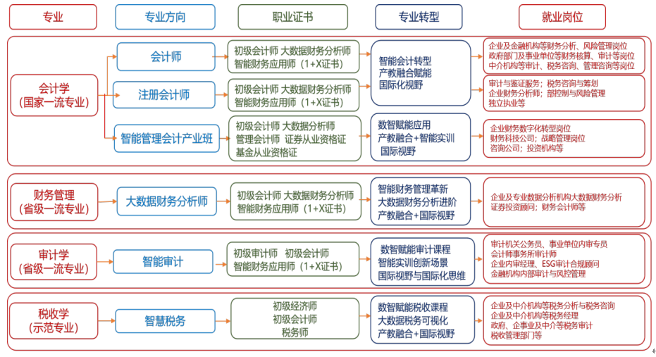 现设置会计学、财务管理、审计学及税收学四个大专业,设置会计师、注册会计师、智能管理会计产业班、大数据财务分析师、智能审计、智慧税务等相互支撑与促进的专业方向。新生入学后可参加“ACCA卓越班”遴选。