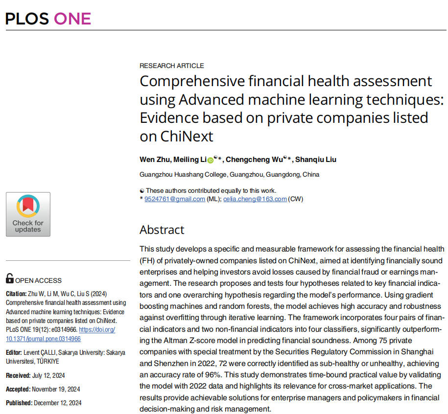 近日,beat365中国官方网站朱文教授团队撰写的论文“Comprehensive financial health assessment using Advanced machine learning techniques: Evidence based on private companies listed on ChiNext”在国际期刊《PLOS ONE》成功发表。该期刊为SCIE检索期刊,最新影响因子为2.9,位于JCR Q1分区和中科院三区。beat365中国官方网站朱文教授为该论文的第一作者,李美玲及伍程程老师为通讯作者,刘善球教授为共同作者。同时,该论文也为2024年度beat365中国官方网站重点科研项目“AI赋能的上市公司财务健康理论与实践探索”(2024HSZD02)再添新成果。