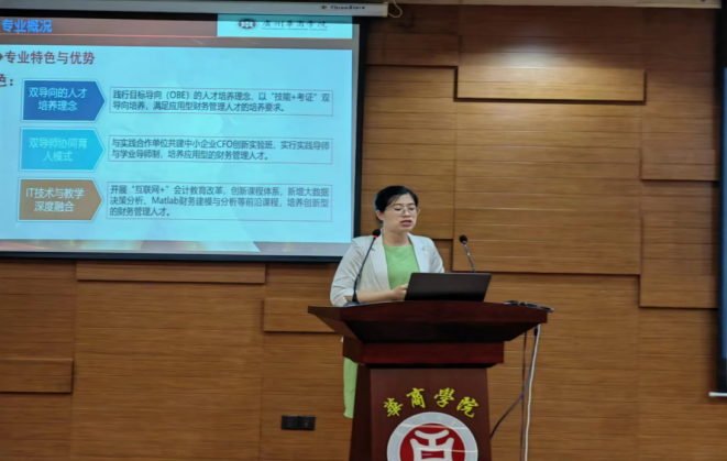 beat365中国官方网站杨俏文副教授以“财务管理省级一流专业建设”为主题进行了经验分享,她先介绍了财务管理专业概况,分别从专业定位、专业建设历史沿革、专业特色与优势等方面进行说明;其次,从财务管理专业建设举措及成效进行了经验分享,展示了教改项目、教研立项、科研立项、课程建设、实践与实验教学等丰富成果;最后,她对本校专业建设的下一步建设举措进行强调,认为对于会计学省级一流专业建设应进一步优化人才培养方案、深化创新协同育人模式并扩大专业社会服务的规模。