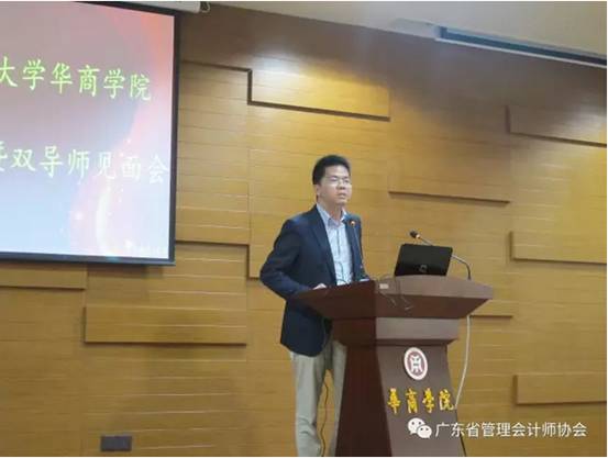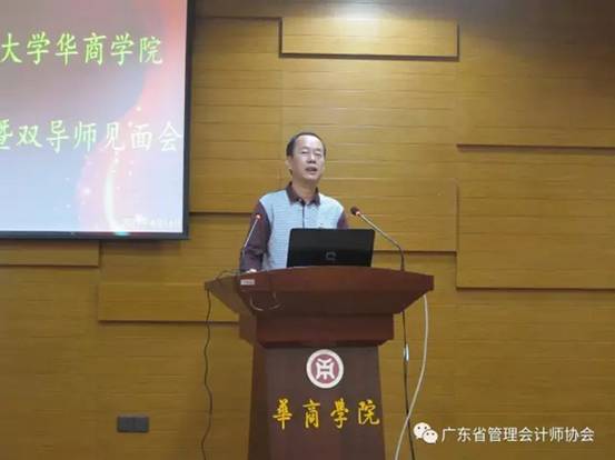 广东省管理会计师协会会长、中山大学管理学院林斌教授首先致辞,他对校外导师的出席表示感谢并简短介绍GAMA创新班。林会长着重阐述了我会的历史使命,他说,“立人”是为中国管理会计培养人才,“立标”是建立中国管理会计标准,“立论”是总结实践经验,形成中国管理会计理论,引领中国管理会计的发展;而“立人”是我会最重要的任务,我会与华商学院合办的本科教育层次的GAMA创新班汇聚了国内实务界和学术界的顶尖专家作为学生导师,这是重要的人才培养模式创新。林会长殷切的期望GAMA创新班同学通过四年的努力,在能力、素质、素养等各方面都得到提升。