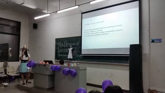 20151026日(周一)晚上七点半,由14ACCA班举办的Halloween&ACCA Brainstorming主题班会在励志楼A103进行。本次班会本着回望过去,展望未来的目的,呈现了一场趣味与学术相结合的盛宴,不仅进一步增强了同学间的凝聚力,坚定了同学们在ACCA这条道路上的决心,更是让同学们对于未来的就业以及发展问题有了更深刻的了解和认识。
