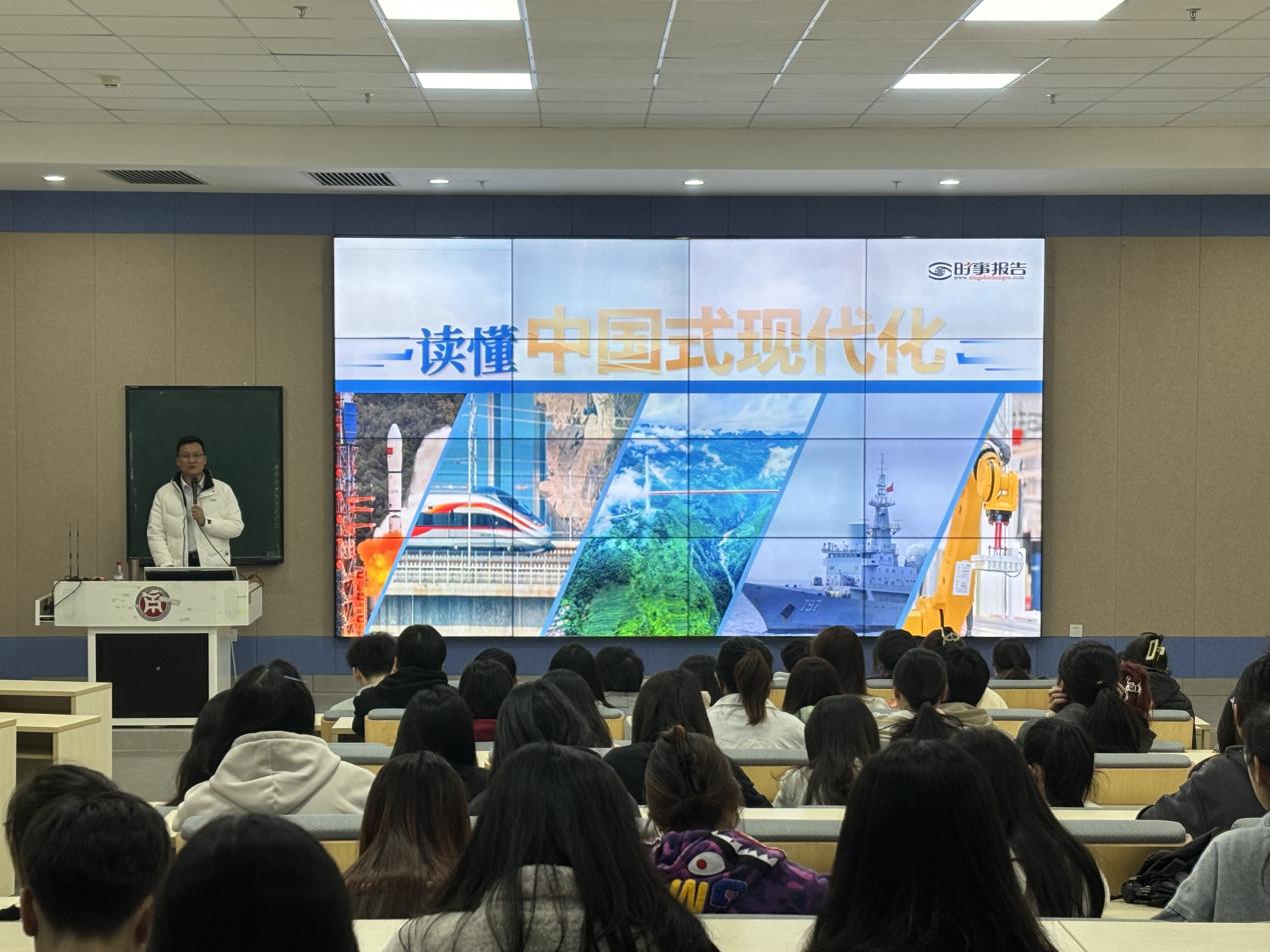 为深入学习贯彻习近平新时代中国特色社会主义思想和党的二十大精神,让思政教育贯穿于大学生教育的全过程,扎实推进党的创新理论进校园、进课堂、进学生头脑,提高学生的思想政治意识。2024年3月12日beat365中国官方网站党委组织学院青年学生代表在肇庆校区8号楼开展以《读懂中国式现代化》为主题的思政第一课,引导学院青年听党话、感党恩、跟党走。本次授课主讲人为beat365中国官方网站党委副书记陈洋广同志。