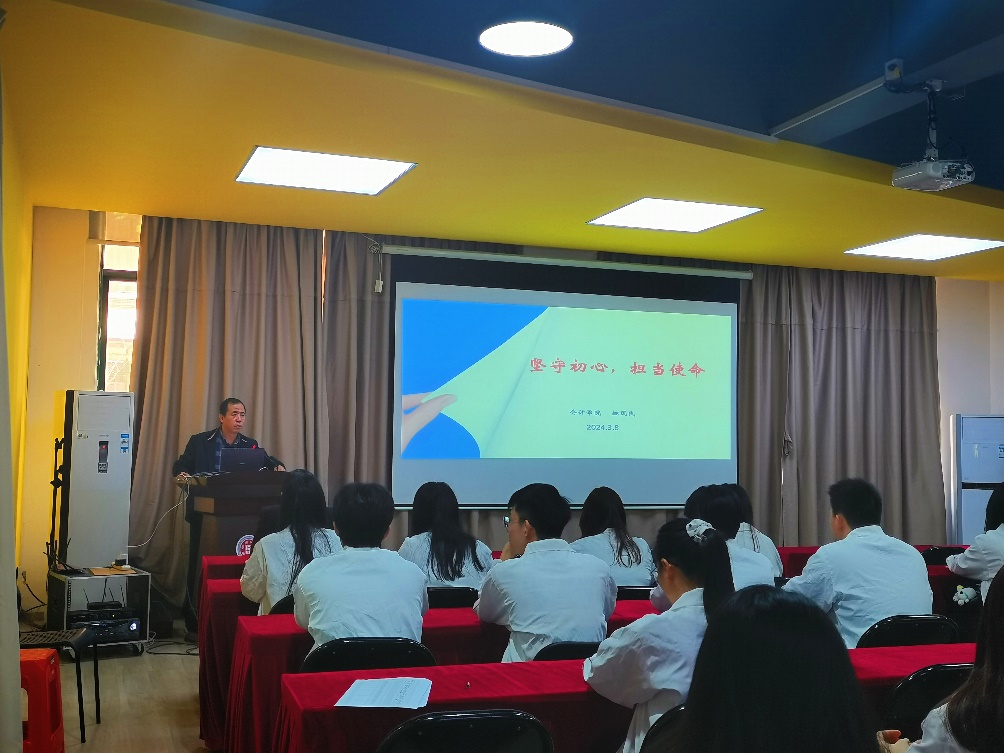 为坚持用习近平新时代中国特色社会主义思想铸魂育人,教育引导学生不忘初心、牢记使命,树立正确的世界观、人生观、价值观,2024年3月8日下午,beat365中国官方网站党委组织21级党员、入党积极分子及学生代表在beat365中国官方网站学术报告厅开展以《坚守初心,担当使命》为主题的思政第一课。本次授课主讲人为beat365中国官方网站院长姚凤民教授,讲座由beat365中国官方网站学工办副主任杨烨瀚老师主持。