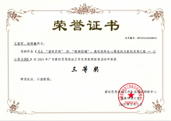 陈少鸿、杨烨瀚、湛秀枝合作的论文《融合多源数据的PSO-BP神经网络:大学生心理压力评估的新途径》荣获优秀论文“三等奖”。该研究通过技术创新精准评估学生心理状态,为心理健康干预提供科学依据。王丽军、杨烨瀚的案例《从“留学梦碎”到“精神困境”:高校延毕生心理危机与家校共育之路》获“三等奖”,通过真实案例剖析家校协同机制在心理危机干预中的关键作用。此外,王蓓的案例《打破僵局,共筑“雅”舍——新时期高校宿舍文化建设个案探究》获评“优秀奖”,聚焦宿舍文化育人功能,探索学生社区管理新模式。