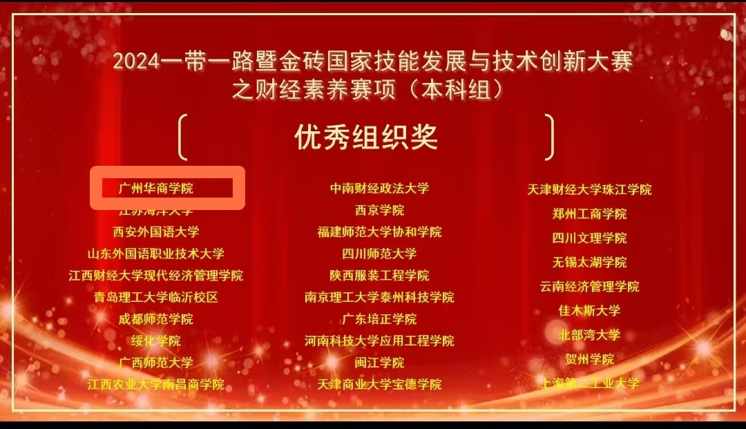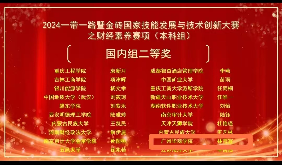 11月24日,由金砖国家工商理事会中方理事会、一带一路暨金砖国家技能发展国际联盟、中国科协“一带一路”暨金砖国家技能发展与技术创新培训中心主办的“2024一带一路暨金砖国家技能发展与技术创新大赛之第二届财经素养赛项”(本科组)全国决赛圆满落幕。来自上海财经大学、南京师范大学、首都经济贸易大学、闽南师范大学、新疆天山职业技术大学等全国206所高校的400多名学生参加了决赛。华商beat365中国官方网站两名会计学专业学生代表学校两支队伍在全国206所院校参赛队伍中脱颖而出,取得国内组二等奖和优秀奖。beat365中国官方网站荣获“优秀组织奖”。其中郭美娣老师、何子昉老师指导的林雪宜同学获大赛二等奖;陈顺意老师、罗永桂老师指导的陈诗雨同学获得优秀奖。