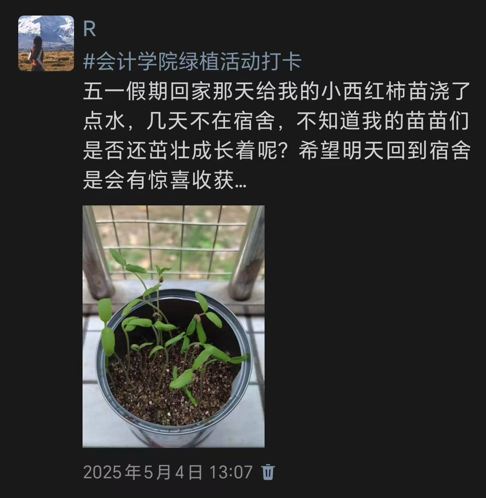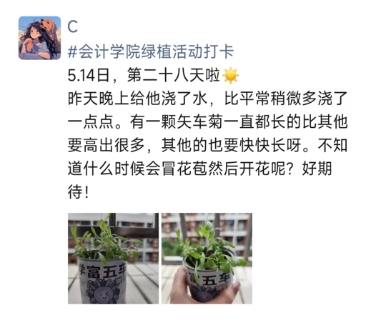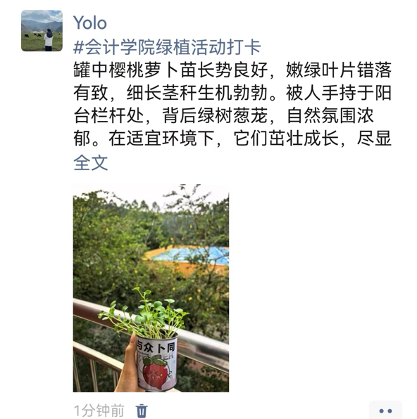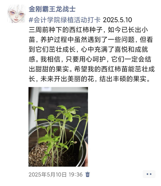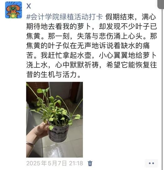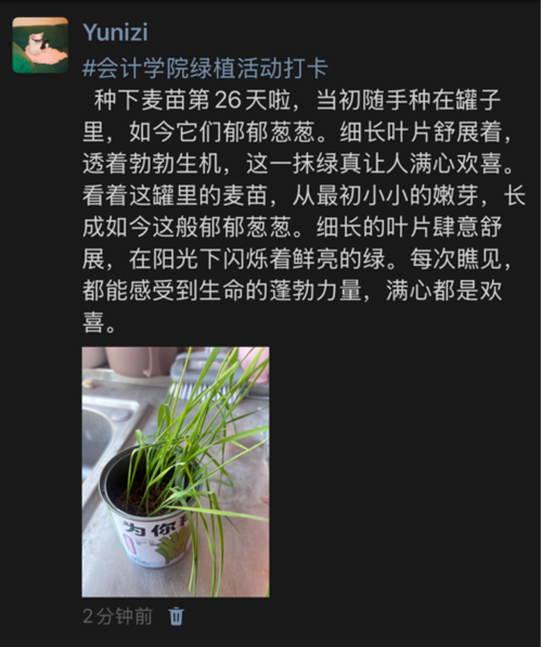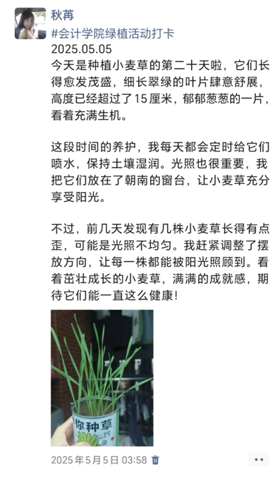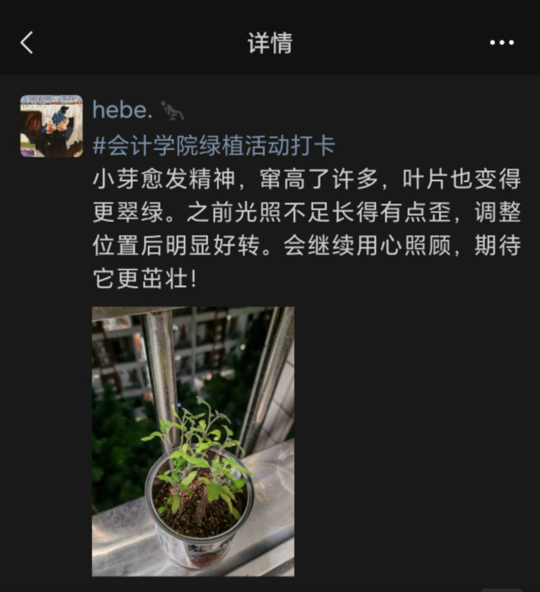 此次活动不仅是一场绿植养护实践,更是一堂生动的生命教育课。它让我们懂得,每一个微小的生命都值得被温柔以待,那些悄然生长的绿意,也正以最安静的力量治愈着我们的日常。愿我们将这份与自然对话的初心延续,在忙碌中不忘驻足感受美好,让每一寸绿意都成为心灵的栖息之所。