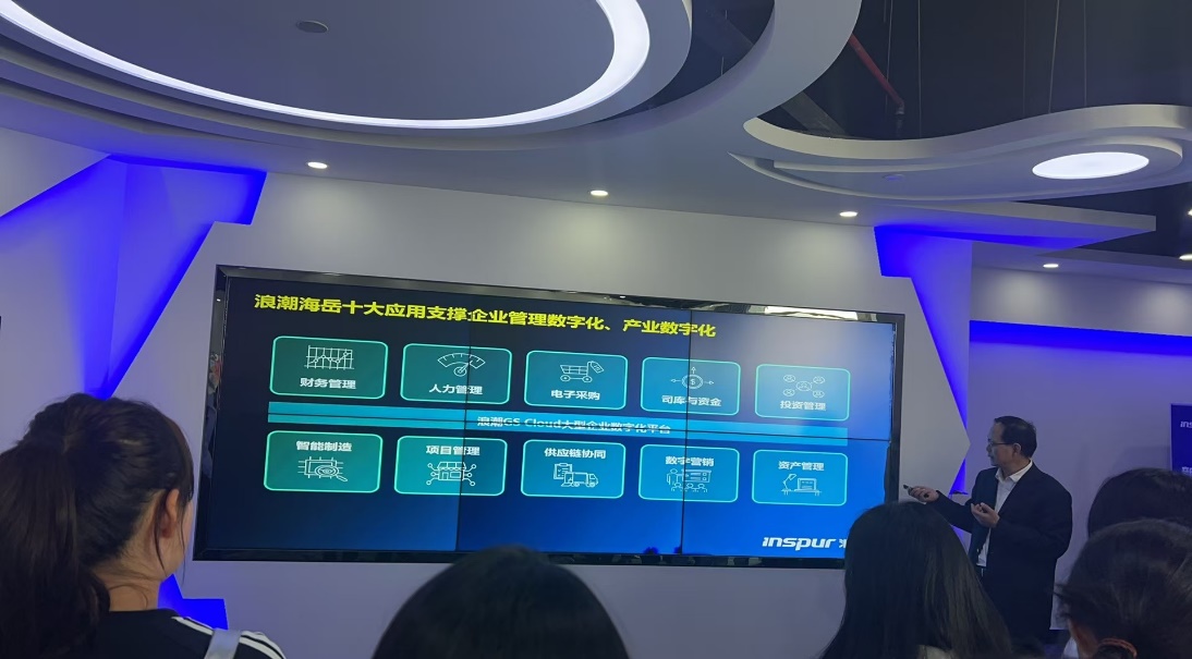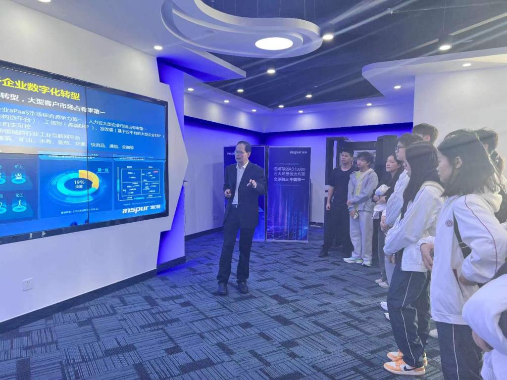 参访活动形式丰富多样,旨在让师生们深入了解企业的运作和行业的前沿动态。首先,在浪潮公司展厅,由柴斌副总带领大家进行参观。展厅中,各种先进的技术产品和解决方案令人目不暇接。从高性能服务器集群到智能化云服务架构,从大数据精准分析系统到 AI 驱动的行业应用模型,浪潮于信息技术领域的斐然成就与创新硕果逐一呈现,科技魅力扑面而来,令师生真切触摸时代科技最强脉搏。