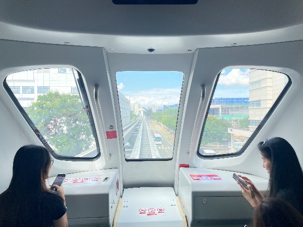 参观过程中,同学们体验了比亚迪“云轨”。作为一种中小运力的轨道交通系统,云轨以其卓越的性能和环保特性,成为比亚迪绿色出行解决方案的重要组成部分。云轨综合优势突出,造价仅为地铁的1/5,建设周期仅为地铁的1/3,具有极强的地形适应能力,噪音低,可从城市建筑群中穿过。